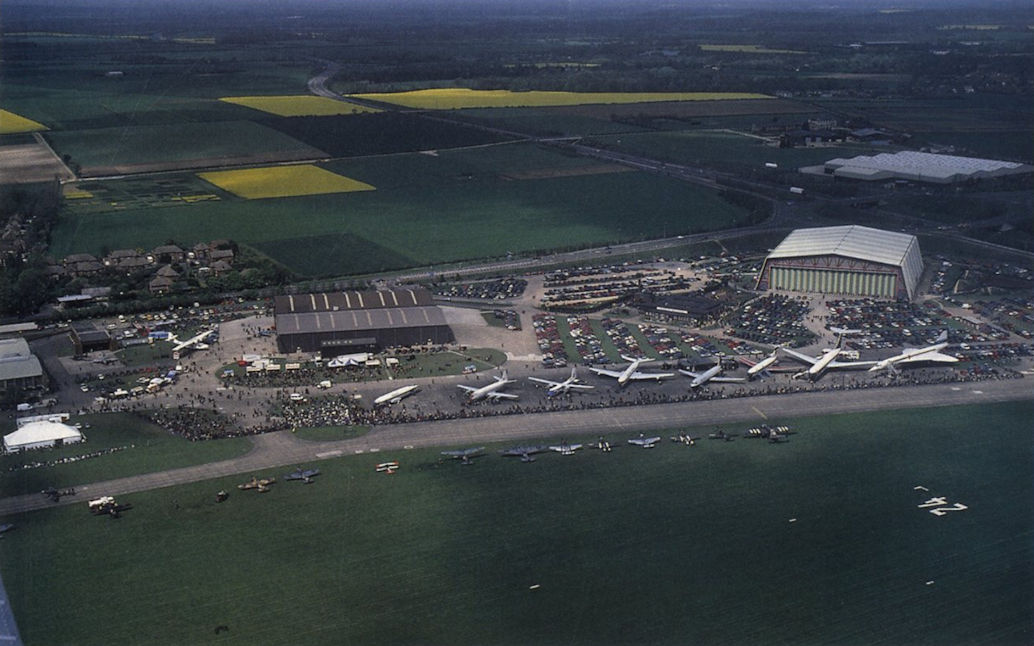 An aerial view of Duxford in all its glory on an airshow day in the summer of 1999. The “Superhangar”, at extreme right behind the VC10 and Concorde, is to be extended to house a new British aviation exhibition, scheduled to open in 2005.