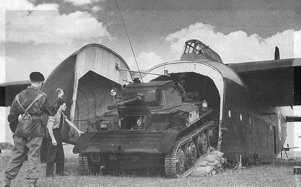 A seven-ton Tetrarch light tank being reversed very carefully into the all-wood Hamilcar.