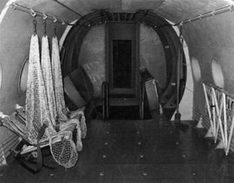 Paratroop seats as fitted in the rear fuselage, with net shrouds for protection when ditching.