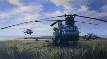 A Chinook and a Lynx are depicted in Refuelling at Kirkcudbright, by Patricia Forrest GAvA.