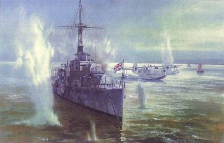 HMS Amethyst under fire in the Yangtse river while Sunderland D Dog of 88 Squadron makes a hurried departure.Самолёты на фотографии: Short Sunderland / S.25 - Великобритания - 1937