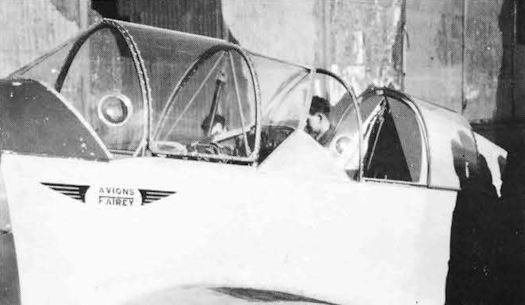 Close-up of the redesigned hood showing the 'pinched-in' mid section and Avions Fairey wings motif on the left side.