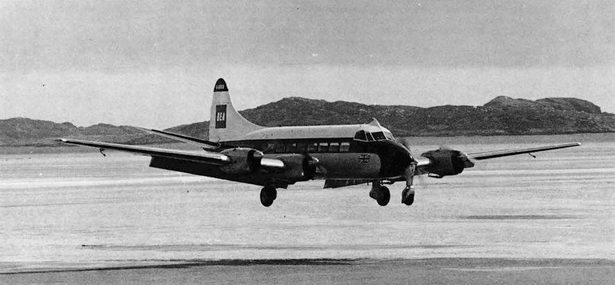 Регистрационный номер: G-ANXB Heron 1 c/n 14048 G-ANXB of BEA, flaps down, about to land on the beach at Barra, Southern Hebrides.