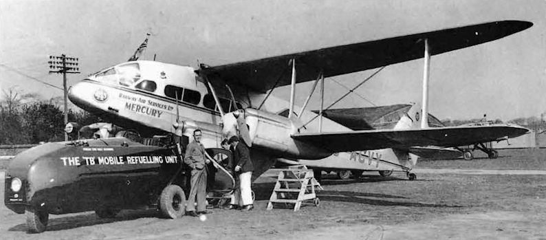 Регистрационный номер: G-ACVY Railway Air Services' G-ACVY "Mercury", the third DH.86, one of four with the short nose for single pilot operation, being refuelled. It was fortunate to avoid a landing incident on 11.2.38.