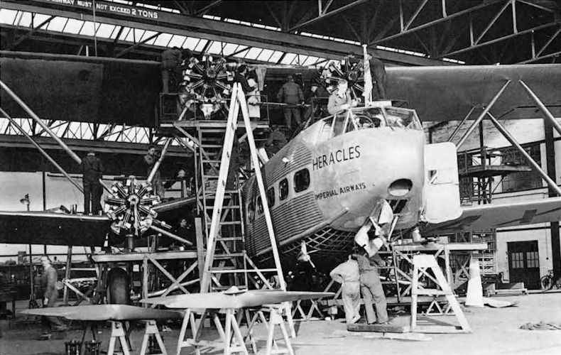 Регистрационный номер: G-AAXC Handley Page HP.42W G-AAXC "Heracles" undergoing an engine check in the hangar at Croydon with all props removed from the Jupiter XFBM engines. G-AAXC was the first commercial aircraft in the world to complete one million miles in passenger service, in July 1937, most of them between Croydon and Paris, which route it continued to operate until the outbreak of war.