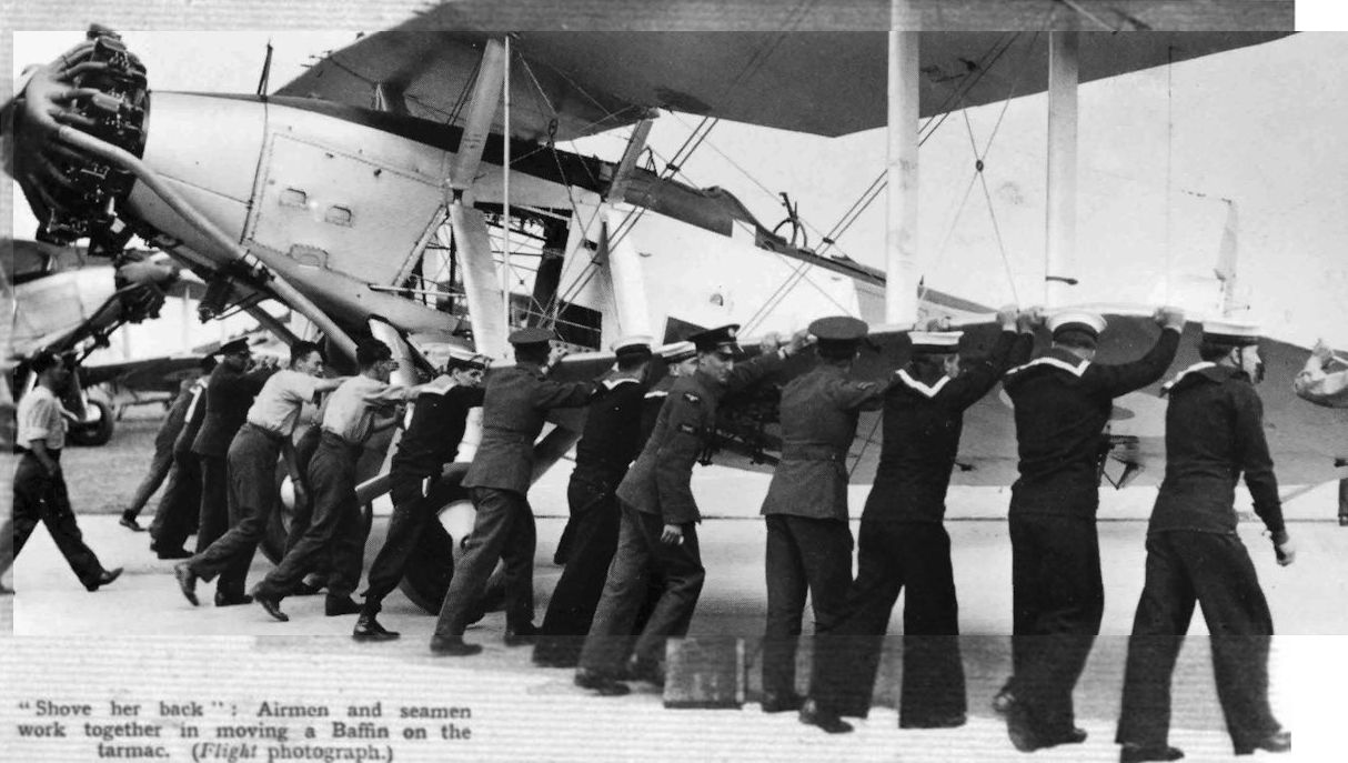 "Shove her back": Airmen and seamen work together in moving a Baffin on the tarmac.