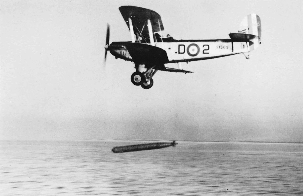Регистрационный номер: S1569 Ripon S1569 of D Flight, Gosport, drops a torpedo on the range at Stokes Bay. Note Gosport chevron on fin