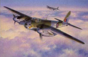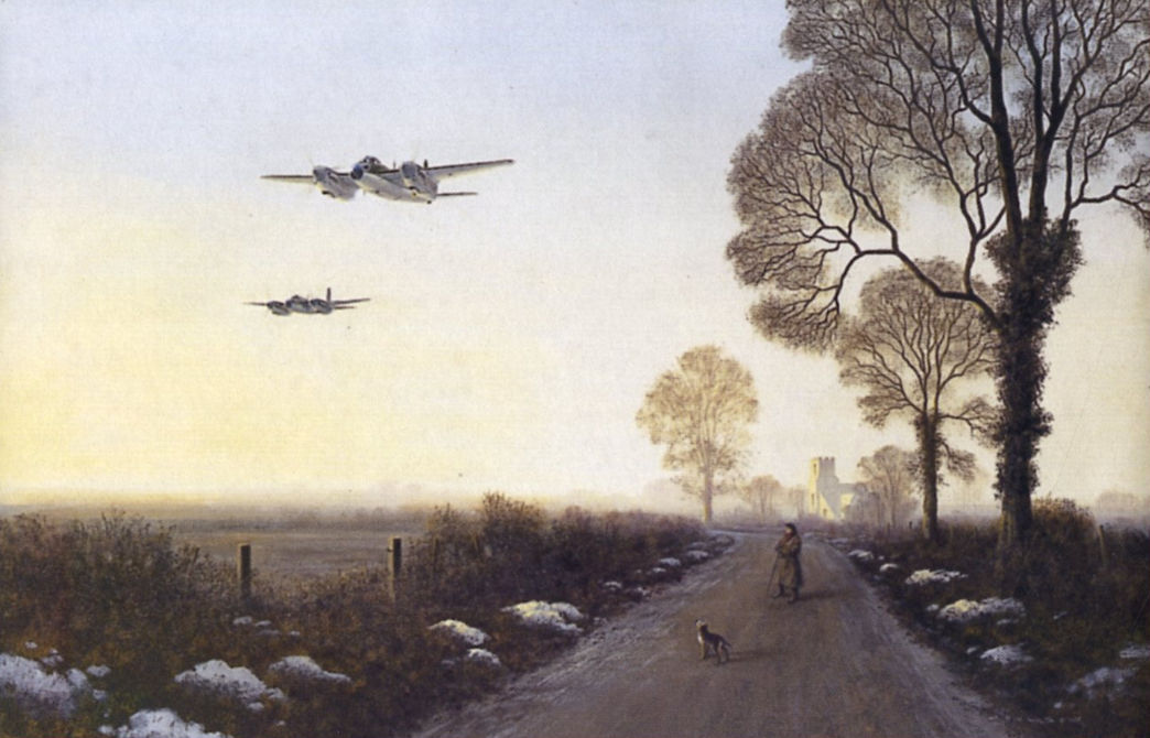 In the Winter of early 1943 Mosquitoes carried out precision bombing raids on specific targets in Germany. This evocative painting depicts two Mk IV Mosquitoes heading home to their base flying low over the Norfolk countryside.Самолёты на фотографии: De Havilland Mosquito B / D.H.98 - Великобритания - 1940