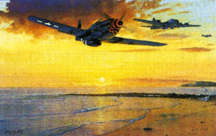 HOMEWARD BOUND. A combat damaged B-17 of the 91st Bomb Group heads home to Bassingbourn shadowed by P-51Ds of the 352nd Fighter Squadron (353rd FG)