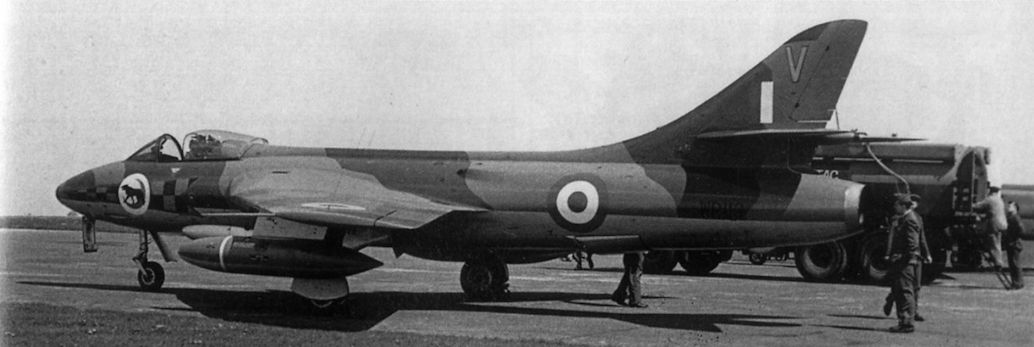Another Hunter F.5 of No 34 Squadron clearly showing the unit badge described as "ln front of a crescent a wolf passant”. The arrowhead markings were black-and-yellow check outlined in purple.