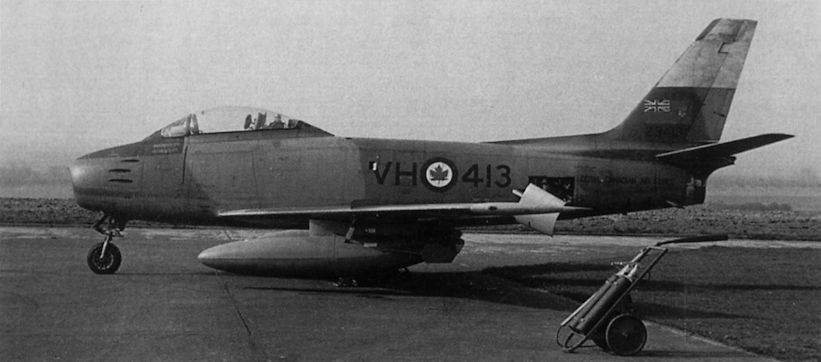 A Canadair-built Sabre 5 of No 444 Squadron, Royal Canadian Air Force, visiting from Germany. The squadron, part of No 1 Air Division, joined No 4 (Fighter) Wing at Baden-Solingen, Germany, in September 1953. While Sabres in Canada were in silver finish, those based in the European theatre were camouflaged.