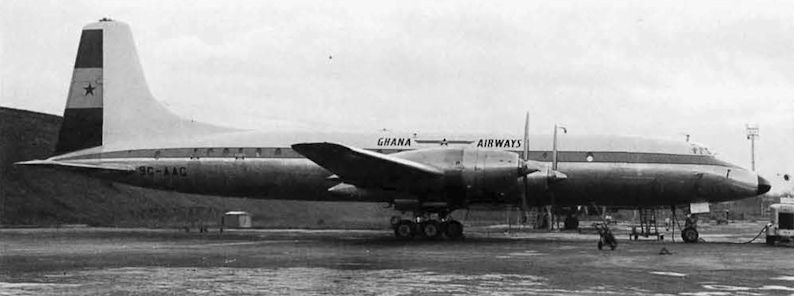 Регистрационный номер: 9G-AAL Ghana Airways' other large turboprop was the Il-18, used on services from Accra to Moscow, Beirut, Rabat and Addis Ababa. This is 9G-AAL which appeared at Heathrow on 5.6.61.