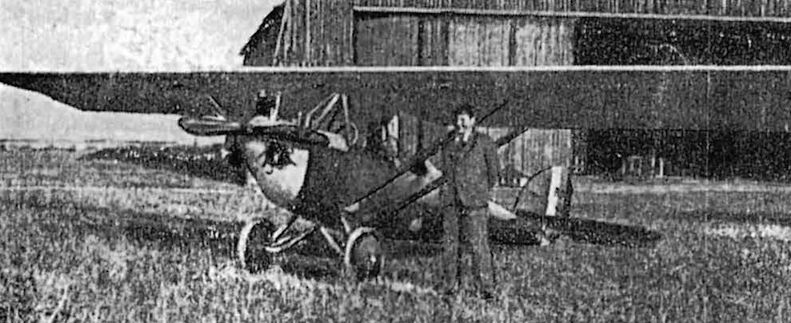The RO-1, showing the untapered square-tipped wing, 3-cyl Anzani engine and small size relative to the young man standing in front.