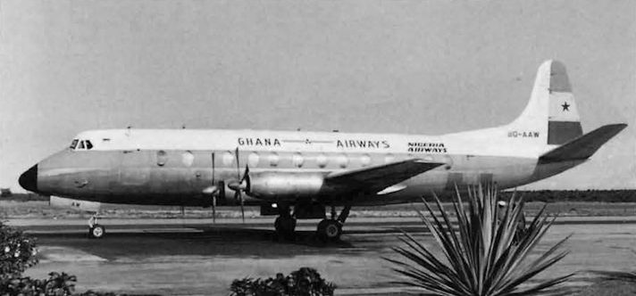 Регистрационный номер: 9G-AAW Ghana Airways' Viscount 838 9G-AAW in a suitably tropical setting while leased to Nigeria Airways.