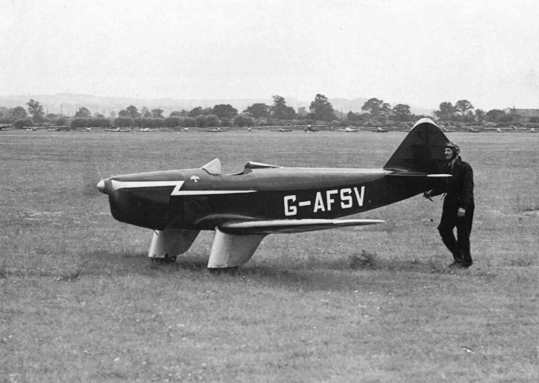 Регистрационный номер: G-AFSV [2] Ranald Porteous had his own technique for moving his Chilton monoplane around which was to lift it by the tailskid with a low throttle setting and let it take him along. It broke the international 100 km closed-circuit speed record in its class.