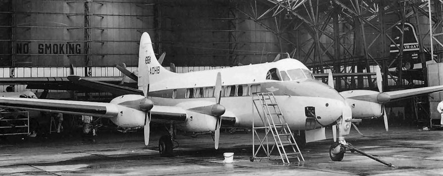Регистрационный номер: G-AOHB, VR-AAT Heron 2D c/n 14100 G-AOHB of Shell following a wash and brush-up outside the company's hangar at Heathrow during the early sixties. A second Heron, either G-AOGC or more likely G-ANUO, may be seen left, with one of their Ambassadors, G-AMAA or G-AMAG visible behind. On the right is the tailplane of Aden Airways Canadair C-4 VR-AAT.