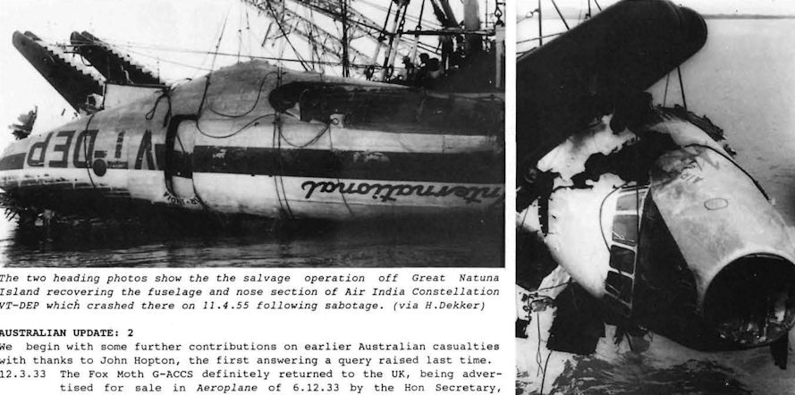 Регистрационный номер: VT-DEP The two photos show the the salvage operation off Great Natuna Island recovering the fuselage and nose section of Air India Constellation VT-DEP which crashed there on 11.4.55 following sabotage.