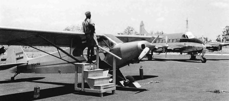 Регистрационный номер: 9G-APM Super Cub 9G-APM which was presented by Israel to President Kwame Nkrumah and was flown by his personal pilot Lt Yitzhak Hirsch of the IDFAF. Painted silver overall with red fuselage flash and spinner and a black registration, it is shown here on a formal occasion in front of a visiting Queen's Flight Heron.