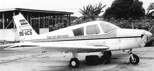 Регистрационный номер: 9G-ACS Cherokee 140 9G-ACS wearing Fun Air Services titles at Accra 25.2.80.