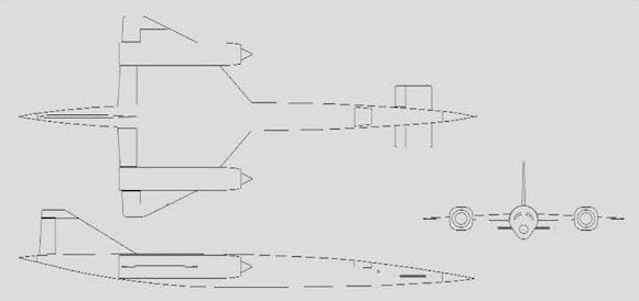 ... however, a revised Specification, RB.156, saw the design modified as a reconnaissance aircraft/bomber (bottom) with a delta wing incorporating nacelles, each containing four Armstrong Siddeley P.176 turbojets and a shock cone at the forward end. The cockpits of both the R.156 and RB.156 were fully enclosed, with only one small side-facing window on each side of the forward fuselage.