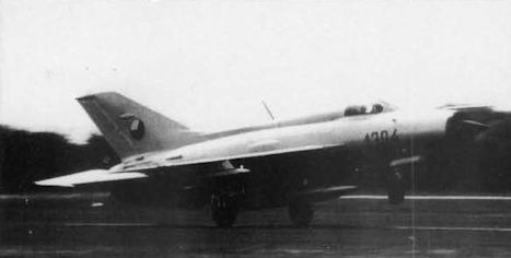 A MiG-21PFM with K-13 IR-homing missiles and twin-DEFA cannon belly pack about to take off on a sortie. The hastily-applied camouflage differed from aircraft to aircraft, and it would seem that the personnel applying camouflage to the nose and rear fuselage had different ideas to the man painting the centre of this particular machine. -