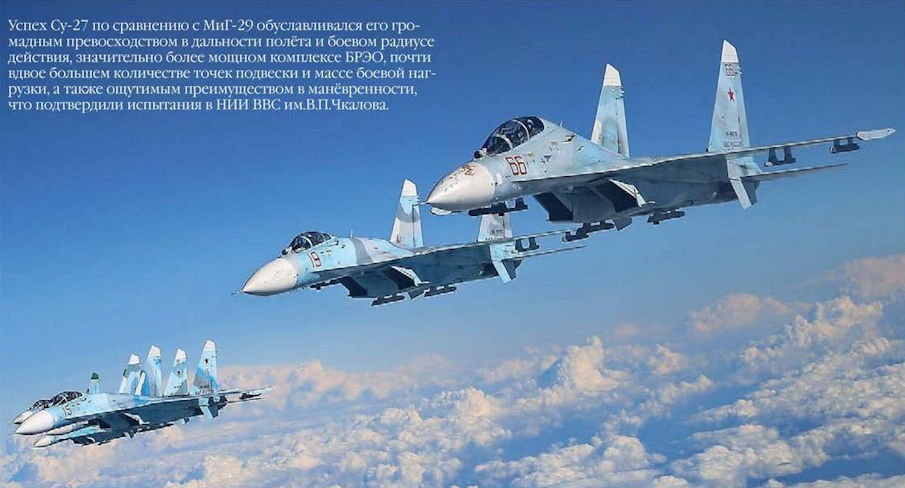 Успех Су-27 по сравнению с МиГ-29 обуславливался его громадным превосходством в дальности полета и боевом радиусе действия, значительно более мощном комплексе БРЭО, почта вдвое большем количестве точек подвески и массе боевой нагрузки, а также ощутимым преимуществом в манёвренности, что подтвердили испытания в НИИ ВВС им.В.П.Чкалова.