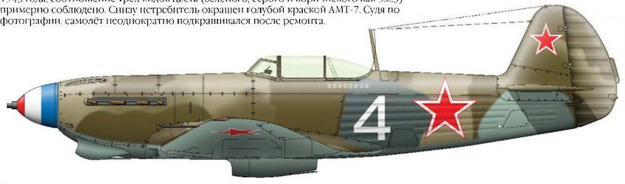 Як-9Т Ролана де Ля Пуапа, осень 1943 года. Самолёт в трехцветном камуфляже на верхних и боковых поверхностях, образованном красками АМТ-1 (коричнево-песочная), АМТ-4 (зелёная) и АМТ-12 (темно-серая). Хорошо видно, что, согласно наставлениям по маскировке первой половины 1943 года, соотношение трёх видов цвета (зеленого, серого и коричневого как 5:2:3) примерно соблюдено. Снизу истребитель окрашен голубой краской АМТ-7. Судя по фотографии самолёт неоднократно подкрашивался после ремонта.