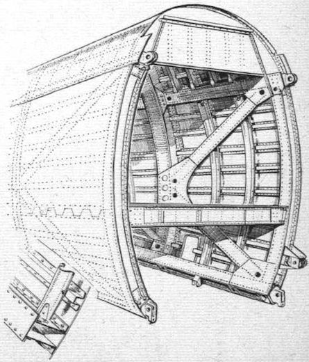 In the Armstrong Whitworth Whitley fuselage the intermediate frames are not in contact with the skin covering. The stringers are turned with the open side towards the skin.