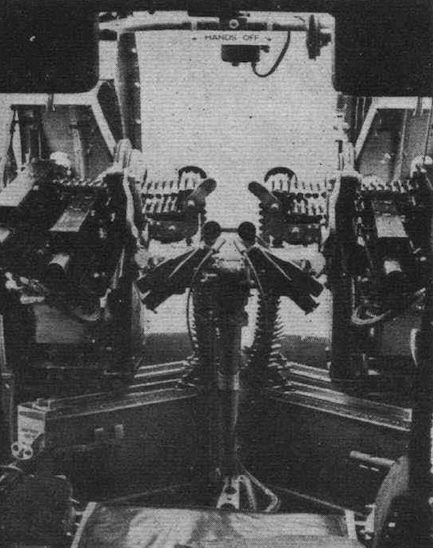 LOOK OUT: A view from the inside of the rear gunner's turret showing the breech blocks of the four Browning guns and the ammunition feeds. The reflector sight is hidden by the turret structure at the top of picture.