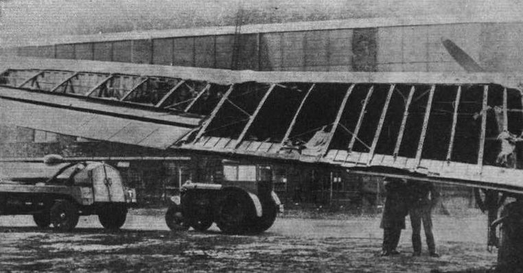 “THE LION HAS WINGS”: But the two Tigers of this Armstrong Whitworth Whitley had practically none, yet they managed to bring the machine home in safety. All the top surface fabric of the port wing was stripped off, and a considerable proportion of that of the starboard wing.