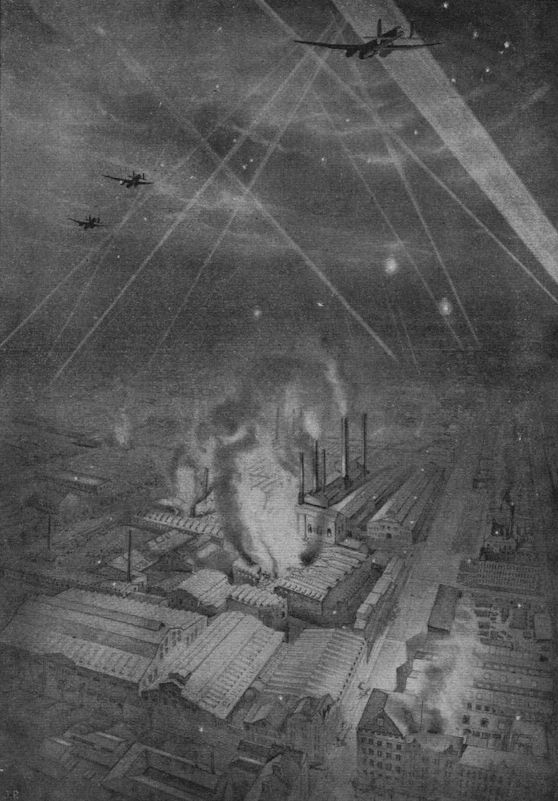 An impression by "J.P." of the R.A.F. attack by Whitleys on the snow-covered Skoda armament works at Plzen in Czechoslovakia on the night of October 27, 1940.