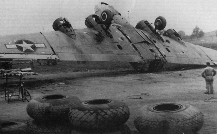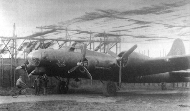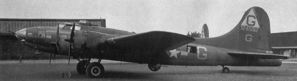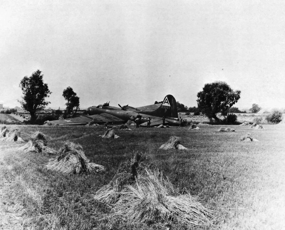 B-17 N 46316 из 358 BS 303 BG на месте вынужденной посадки. В таком виде американские самолеты находили ремонтные бригады. Первое, что они делали, это наносили поверх опознавательных знаков США красные звезды.