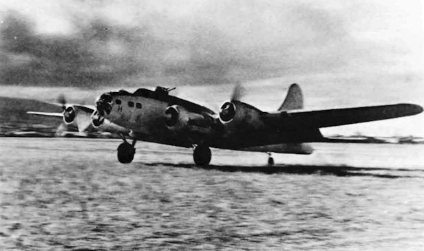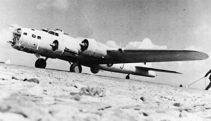 View of Fortress 41-9234 taken from 10,000 ft by a B-17 of the 8th Photo Reconnaissance Squadron on January 26, 1943. Note how soil piled up at the port wing root as the aircraft slid sideways.