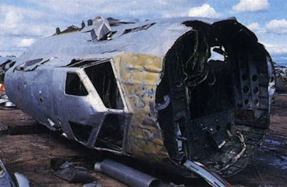 41-9234 sits in a tranquil field of kunai grass in August 1993. The large break in port side of the fuselage coincided with the forward end of the radio compartment where several of the crew were located during the crash landing. The RAF roundels are still visible on the wing and fuselage side.