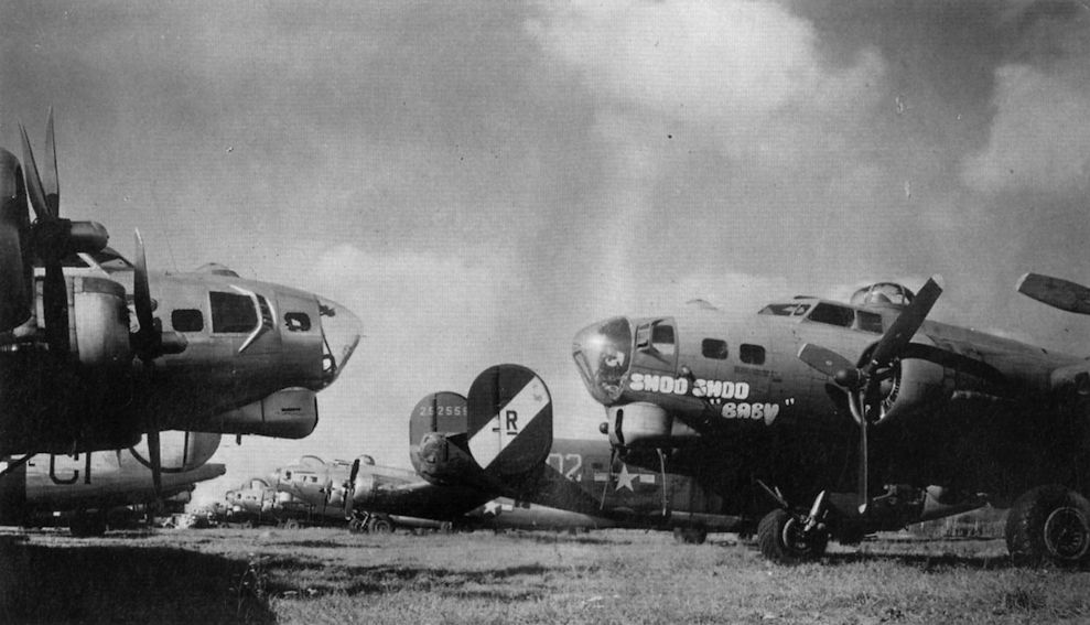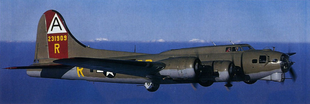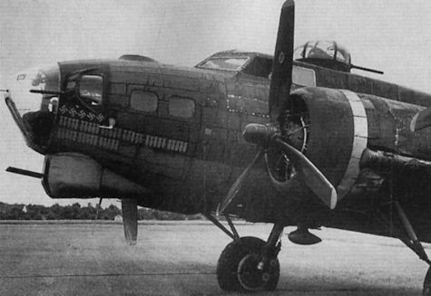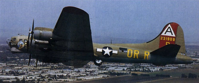 B-17F "Летающая крепость". Этот Boeing B-17F-40-BO (42-5177) из 303-й бомбардировочной группы летом 1943 года участвовал в операциях, в которых действовало до 300 самолетов. На самолете изображена эмблема, типичная для периода с июля 1942 по июль 1943 года.