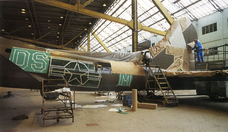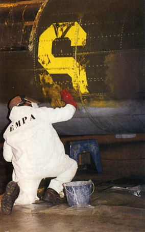 «Мемфис белль» в процессе восстановления. Реставраторы постарались сохранить исходные надписи и рисунки