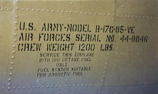 The number 3 and 4 engines were rendered useless by flak over Lae but were allowed to windmill until the japanese fighters had withdrawn. Ray Dau succeeded in feathering number 3 but not, as can be seen from the angle of the severed blade, the outer engine. The main fin section has weathered to a red colour from the original Medium Green finish applied by Boeing's subcontractor.
