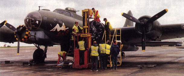 Регистрационный номер: G-BEDF [29], N17TE [29] On the Channel Island of Guernsey, work to replace the port inner engine on Boeing B-17G Flying Fortress G-BEDF Sally B is progressing. On Saturday October 10, 1998, the offending engine had its oil drained, and the fuel lines and control links were all disconnected. The following Saturday saw the removal of the engine, the crew from the mainland being assisted by personnel from Aircraft Servicing of Guernsey Ltd. The bomber has been on the ground since September 16.