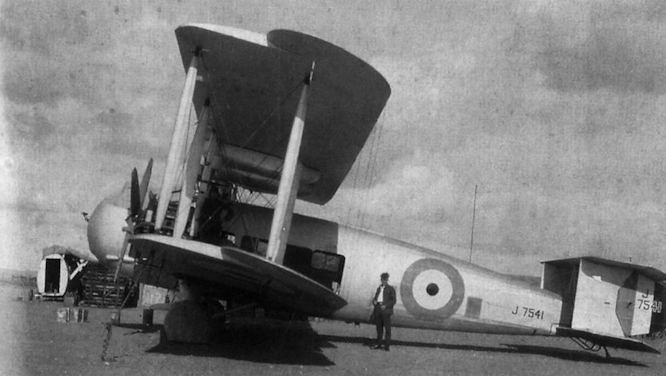 The Vernon was a troop carrier powered by two 450 h.p. Napier Lion engines. J7541 flew with No 70 Sqn and Plt Off Spaight and Mr Steer are just visible in the cockpit. Note the inspection panels on the top wing. -