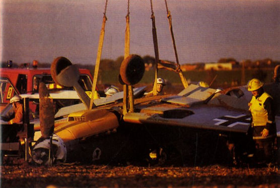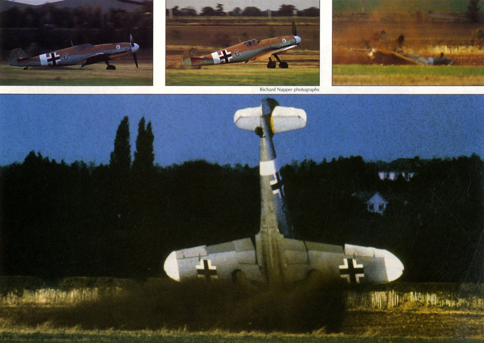 Регистрационный номер: G-USTV [27] Messerschmitt Bf 109G 10639/G-USTV “Black 6" lands in a stubble-field across the M11 from Duxford and turns over.