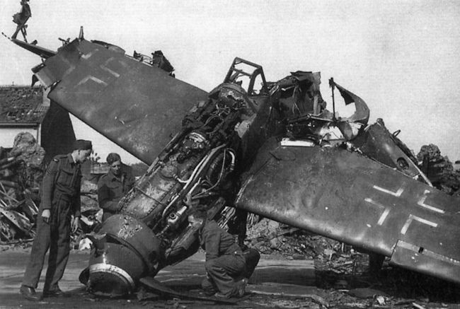 The Daimler-Benz DB 605 engine of a shot-up Messerschmitt Bf 109 being scrutinised by the Allies at Antwerp in 1944.