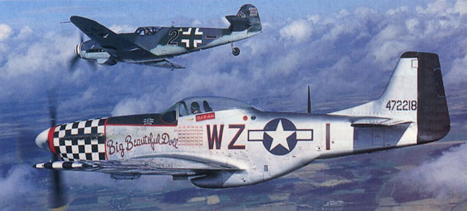 Несмотря на крутой вираж, этот Bf 109G не может уйти от огня преследующего его американского истребителя. Абсолютное численное превосходство ВВС США и Великобритании, в конце концов, сломило сопротивление опытных немецких ВВС на Западе.