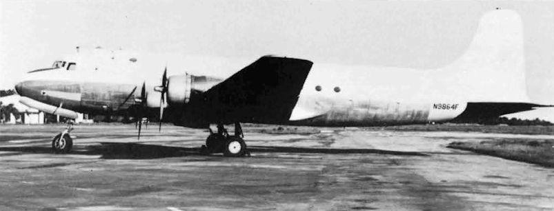Регистрационный номер: N9864F Douglas C-54 N9864F had a complex history of owners and leases. It is therefore perhaps not surprising to see that it carries no titles in this photograph, date and place unknown.