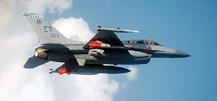 В полете F-16D с двумя инертными бомбами B61-12