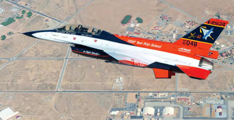 The X-62A VISTA aircraft flying above Edwards AFB, California. The X-62A has played a pivotal role in the development of flying control software for autonomous platforms