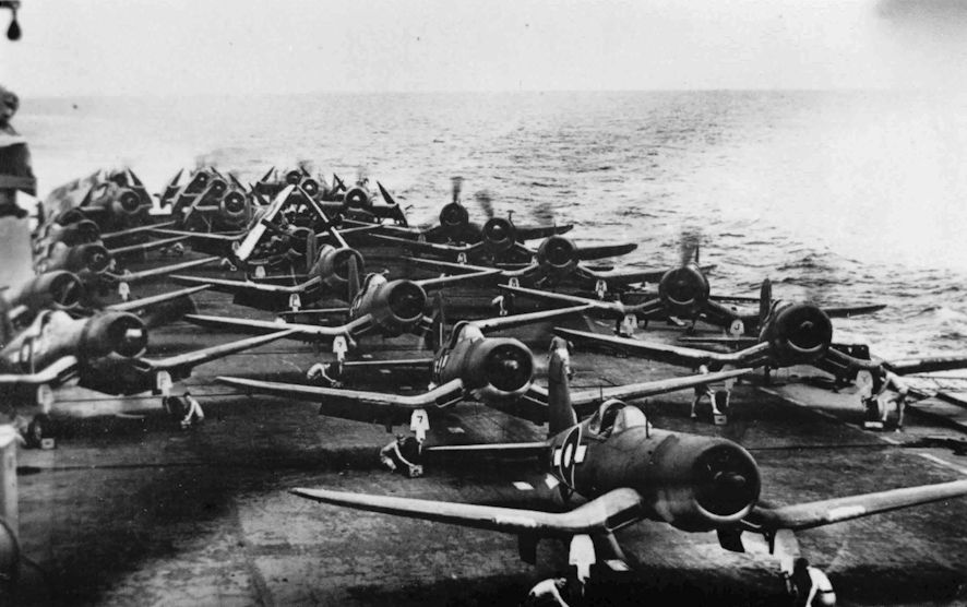 Первые эскадрильи авиации Корпуса морской пехоты США освоили новую технику к декабрю 1942 г. С февраля 1943 г. "корсары" морской пехоты начали действовать с сухопутных аэродромов на о. Гуадалканал. С марта они появились на Новой Георгии. Первым из авианосцев новую технику получил "Коур" - в марте 1943 г. За ним в мае последовал "Банкер Хилл". В ноябре 1943г. самолеты впервые были применены с авианосцев "Эссекс" и "Банкер Хилл" у о. Новая Британия (прикрывая бомбардировщики в налетах на Рабаул), но широкое использование в палубной авиации они получили только с конца 1944г.