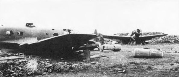 Other aircraft in the vicinity of 1H+LN when it exploded suffered extensive damage, including this He 111 some distance from the explosion. The wrecked bombers were all dismantled and the unit was out of action for several days, at a time when they were much needed for operations.