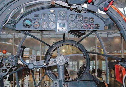 Inside the fuselage, looking forward from the air gunner's position, with the racks for four bombs visible on each side of the narrow passage to the cockpit.