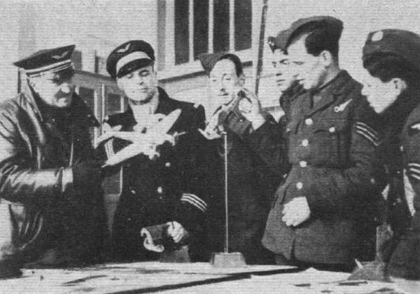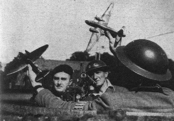AS THE WELLINGTON IS TO THE HEINKEL: Members of the Observer Corps putting their spare time to profit by studying the differences between representative British and enemy aircraft types.