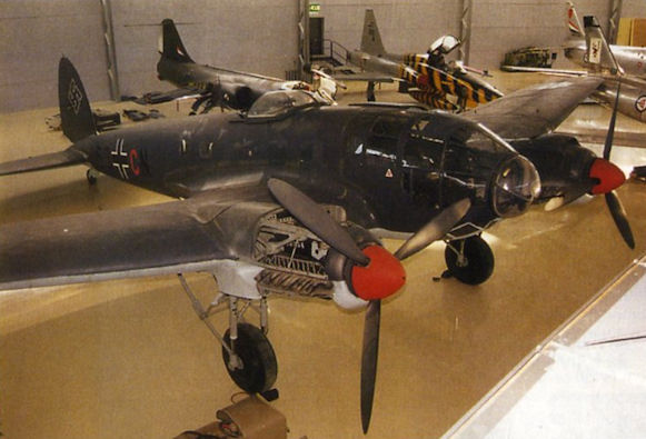 HEINKEL HE 111K (Modified). Compared with its predecessor this model has a redesigned nose which is almost entirely transparent, and a “permanent” lower gun position which might also be used for observation purposes. The engines are Daimler-Benz DB 601s or Junkers Jumo 211s.